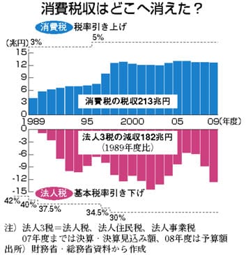 消費税の税収は、導入いらい累計で二百十三兆円(二〇〇九年度予算含む)。同じ時期に大企業などが納めた法人三税(法人税、法人住民税、法人事業税)は相次ぐ減税などで累計百八十二兆円も減りました。
