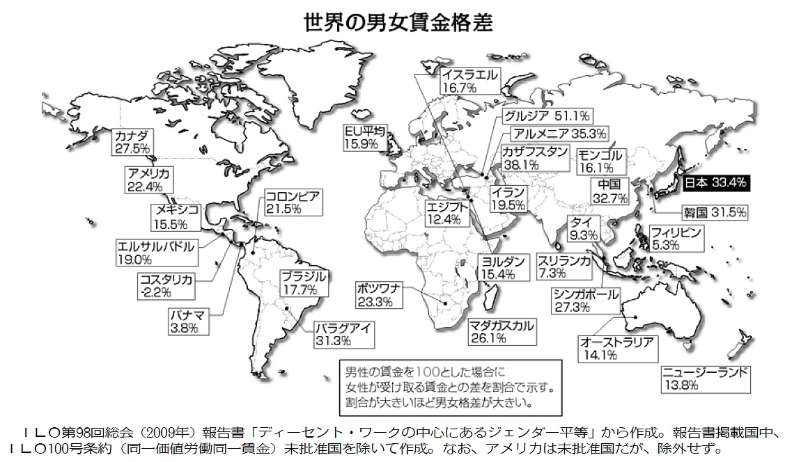 ILO第98回総会(2009年)報告書「ディーセント・ワークの中心にあるジェンダー平等」から作成。報告書掲載国中、ILO100号条約(同一価値労働同一賃金)未批准国を除いて作成。なお、アメリカは未批准国だが、除外せず。