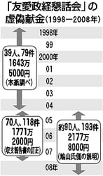 これによると、▽98年3人(献金額の合計37万5000円)▽99年4人(96万円)▽00年2人(48万円)▽01年4人(82万円)▽02年8人(136万円)▽03年22人(574万円)▽04年36人(670万円)―と、架空名義の人数、献金額とも増加傾向にありました。