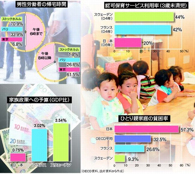 子育てと両立できない、世界でも異常な長時間労働。不安定で低賃金の雇用が広がって「ワーキングプア」が増大し、若い世代が結婚すらできない状況をつくり出しています。