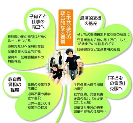 日本共産党は総選挙政策で「総合的な子育て支援」を打ち出しました。(1)働き方の改革(2)経済的支援(3)「子どもの貧困」の打開―の三つの柱です。「子育てしにくい社会」をただそうという考えにたったものです。