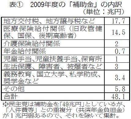 「その他」5・8兆円の補助金には、米軍のグアム移転経費や原発推進の補助金、政党助成金など、削減・廃止すべきものも含まれています。しかし、これらを全部削ったとしても9・1兆円にはほど遠い額です。そもそも民主党は政党助成金などには手をつける気もありません。