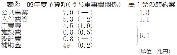 補助金以外はどうでしょうか。公共事業のムダを削るのは必要ですが、民主党は東京外環道路などに賛成しており、大幅な削減ができるのでしょうか。また、人件費や庁費等(物件費)の4割、施設費の6割は軍事費関係であり、軍事費を「聖域」にしたままで、これらの経費を大幅に削ることができるのかも疑問です(表2)。