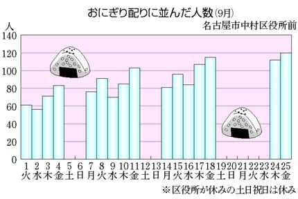 名古屋市の中村区役所前で、昼におにぎりやみそ汁を配る「おにぎりの会」に区役所横の横断歩道の向こうまで、行列が続きます。