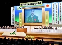 JA全中(全国農業協同組合中央会)は8日、第25回全国大会を東京都渋谷区のNHKホールで開催しました。大会には、約2500人の農協組合長や農家、農協職員などが参加。農政運動の方針について「政府・与党をはじめ、全ての政党に対して生産現場の農家組合員の声を主張し、国政に反映するという国民運動」をおこなうことを特別決議しました。