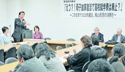 ![]() (写真)母子加算復活と引き換えの高校就学費廃止は許さないと開かれた緊急集会であいさつする山下芳生参院議員(左から2人目)、左は紙智子参院議員=21日、衆院第1議員会館 |