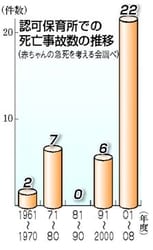 その結果、認可外施設での事故が全体の約85%と多いものの、認可保育所でも、00年度までの40年間に15件だった死亡事故が、01年度以降の8年間では22件と大幅に増えていることが分かりました。