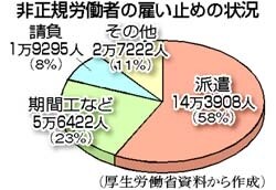 厚生労働省が27日発表した非正規労働者の雇い止め状況によると、昨年10月から今年12月末までの失職・失職予定者は24万6847人にのぼります。前月調査時点から2539人増加しました。都道府県別では、トヨタ自動車グループの地元、愛知県がトップで、4万1145人でした。