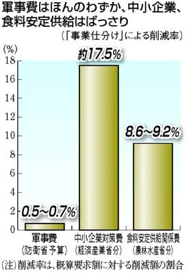 しかし、「仕分け」の結果を集計し、それを分野ごとに「仕分け」してみると、削減の矛先がどこへ向けられたかが分かります。本紙が、「仕分け」による削減額の概算要求額に占める割合を試算したところ、軍事費の削減率はわずか0・5〜0・7%でした。一方、経済産業省の中小企業予算の削減率は実に17・5%。軍事費の25倍から35倍の大幅な削減率となりました。農林水産省の食料安定供給予算も削減率8・6〜9・2%と大幅です。