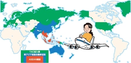 TAC(ASEAN+42カ国=加入を表明した国を含む*)日本、中国、韓国、インド、オーストラリア、ニュージーランド、パプアニューギニア、スリランカ、モンゴル、ロシア、東ティモール、バングラデシュ、フランス、パキスタン、北朝鮮、米国、EU(27カ国)*