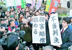 ![]() (写真)支援に集まった人たちに判決結果を知らせる弁護士=18日、最高裁判所前 |