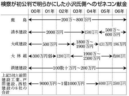 18日の初公判で、検察側が紹介した小沢事務所のパソコンから復元した献金リストによると、小沢氏側は鹿島はじめゼネコン8社から2000〜06年の7年間にあわせて6億円前後の献金を受けていました。(図参照)