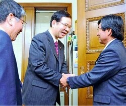 米軍新基地建設の反対を公約に沖縄・名護市長選に勝利した稲嶺進市長が17日、国会内の日本共産党の控室を訪れ、日本共産党の志位和夫委員長と懇談しました。
