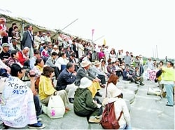 ![]() (写真)辺野古のテント村で、具志堅市議(右端)から説明を受ける4・25沖縄県民大会の本土代表団=24日、沖縄県名護市 |