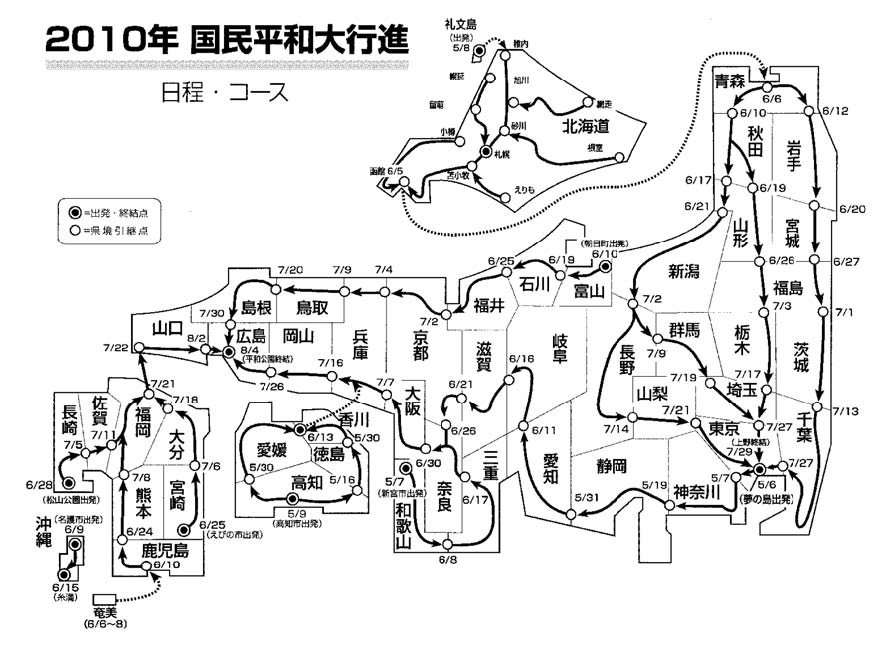 2010年原水爆禁止国民平和大行進(同行進中央実行委員会主催)は6日、東京・夢の島(東京―広島コース)からスタートします。全国11の幹線コースで行進し、さらに全自治体の通過を目標にした網の目行進が繰り広げられます。