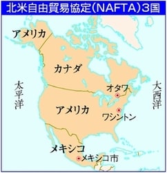 北米自由貿易協定(NAFTA) 1994年1月1日に発効したカナダ、米国、メキシコの3カ国間の自由貿易協定。貿易と投資の自由化だけでなく、貿易紛争処理など広範な内容を持ちます。2003年までにほとんどの品目で関税を撤廃。最後まで残ったトウモロコシなど農産物の関税も、08年1月にすべて撤廃されました。