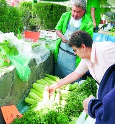 ![]() (写真)露店の野菜売り場でトウモロコシを手にする女性=メキシコ市内 |