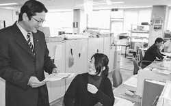 ![]() (写真)町職員と話す茂木祐司町長(左)=長野・御代田町役場 |