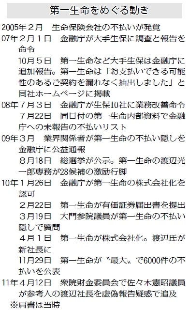 ところが上場後の10年11月、同社は最大6000件にのぼる新たな不払いを発表しました。この不払いケースは、一つの病院で治療した分の保険金を契約者が第一生命に請求したものの、他の病院での治療分を請求し忘れた「別病院事案」と呼ばれるものなどです。