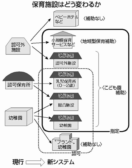 「新システム」では、現行の幼稚園、保育所の「垣根を取り払い、新たな指針に基づき、幼児教育と保育をともに提供するこども園に一体化」(基本制度案要綱)するはずでした。