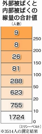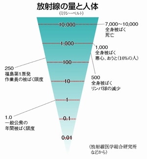 A 放射線防護学が専門の野口邦和・日本大学専任講師は、「500ミリシーベルトという線量は、一度に短時間にあびれば白血球の減少など急性障害が心配される量です。今回は内部被ばくが主でもっとゆっくりと放射線をあびており、急性の影響は緩和されます。ただ、内部被ばくはデータも少なく、がんのリスクなど長期の影響に注意が必要」といいます。