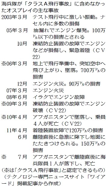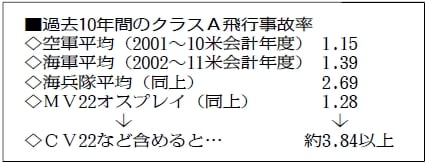 このほか記事は、10年4月にアフガニスタンで乗員4人が死亡した墜落事故など、CV22の事故を含めていないと批判。これを含めれば、事故率は約3倍になり、米軍の平均を上回ると指摘しています。(別項)
