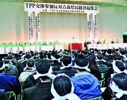 環太平洋連携協定(TPP)交渉参加に反対する青森県民総決起集会が24日、青森市の産業会館で開かれました。「TPP交渉参加阻止対策県本部」(本部長・工藤信県農協中央会長)が主催したもので、県漁連、県りんご協会、県医師会、県生協連なども協賛。会場は2200人の参加者で埋まり、「TPP交渉参加阻止」の強い決意を示しました。
