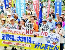 最後に、滋賀県生活協同組合連合会の水原渉会長が「増税阻止へがんばろう」と呼びかけ、参加者がこぶしをつきあげ唱和しました。集会後、市中心部までデモ行進しました。