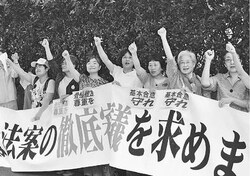![]() (写真)「参院は総合支援法案を採決するな」と唱和する人たち=19日、国会前 |