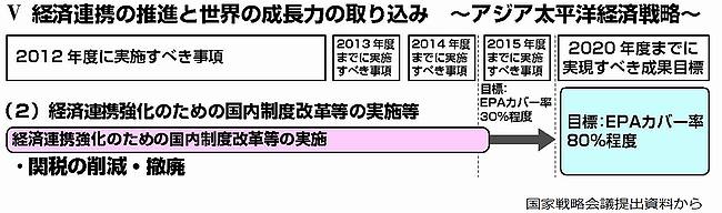 紙氏は、政府が「日本再生戦略(案)」で経済連携協定の締結国との貿易割合(18・6%)を80%まで高めることを目標に掲げ、工程表で2012年度に「関税削減・撤廃」と書き込んでいると追及(上図)。野田佳彦首相は「FTAAP(アジア太平洋自由貿易圏)が実現できれば80%のカバー率になる」と述べ、TPP参加を前提にしていることを否定できませんでした。