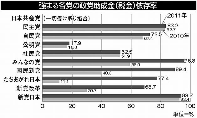 各党が2011年中に受け取った政党助成金(政党交付金)が収入全体に占める割合=「税金依存率」が前年比でのきなみ上昇し、民主党が83・2%、自民党が72・5%となりました。みんなの党も前年の58・9%から37・9ポイントも急増し96・8%。11月30日に総務省が公表した政治資金収支報告によって明らかになりました。(グラフ参照)