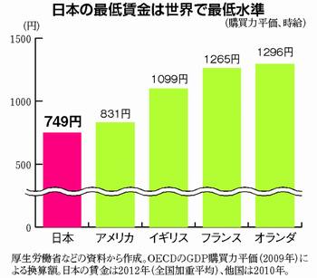 ところが、日本の最賃は欧米主要国に比べて最低の水準(全国平均時給749円)で、フルタイムで働いても月12万円程度。「労働者が健康で文化的な最低限度の生活を営む」(最賃法)水準からはかけ離れています。