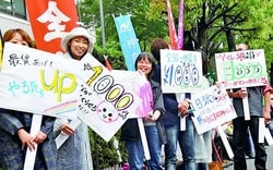 ![]() (写真)最低賃金を1000円以上にと訴える全労連・国民春闘共闘の労働者=6月22日、厚生労働省前 |