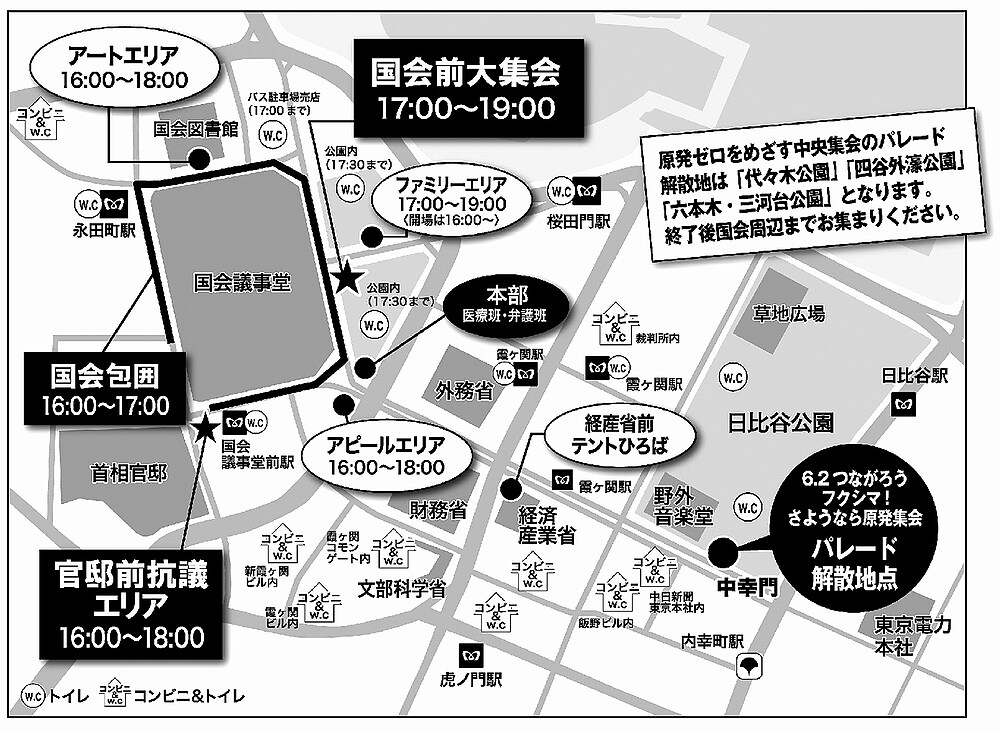 同時アピールとして、4時から6時まで首相官邸前抗議エリア、アートエリア(国会図書館前)、アピールエリア(財務省上交差点)が設けられ、5時から7時まで国会正門前北側にファミリーエリアが設けられます。