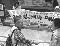 ![]() (写真)「慰安婦」問題解決を訴え宣伝する人たち=5日、広島市内 |