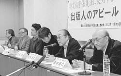 ![]() (写真)特定秘密保護法に反対する出版人のアピールを表明する編集者ら=19日、東京都千代田区 |