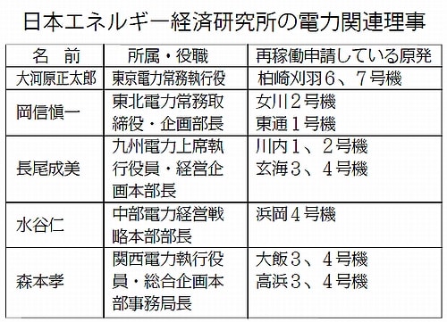 原発利益共同体の一つ、「日本エネルギー経済研究所」の役員として名前を連ねる電力会社の幹部の数が、東京電力福島第1原発事故後、3人から6人に増えていることが本紙の調べでわかりました。