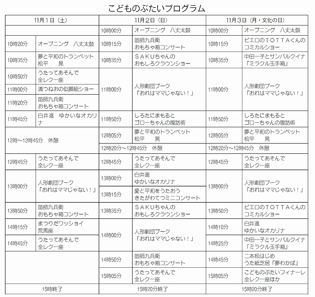 「こどものぶたい」は八丈太鼓のオープニングで始まり、トランペットやオカリナ演奏など、親子で楽しめるプログラムが目白押しです(表参照)。