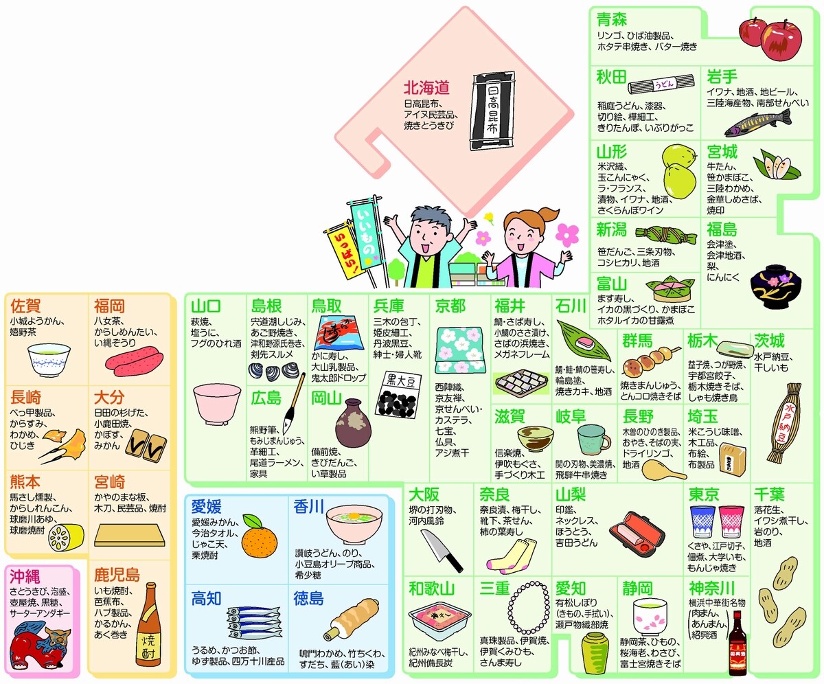 赤旗まつりの楽しみの一つは、「買う」「食べる」です。日本を丸ごと味わうことができる全国物産模擬店・「ふるさと味の店」は、赤旗まつりの“名物”となっています。今回も、全国の陶磁器や地場産業の製品、地酒、そして味自慢をたっぷりそろえて、みなさんをお待ちしています。(イラストの出品内容は一部です。変更になる場合があります)