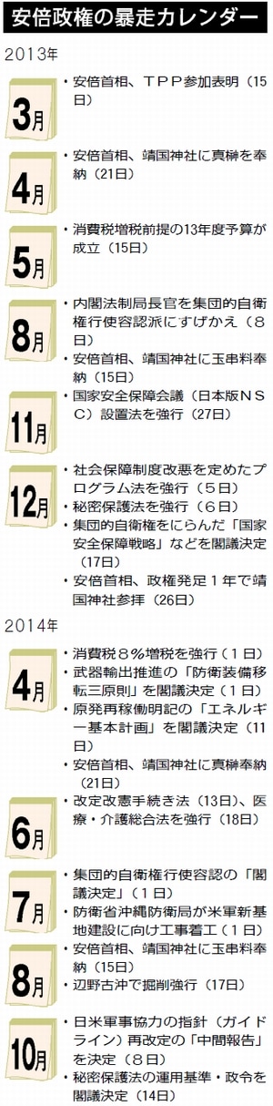 安倍政権は7月の「閣議決定」で集団的自衛権行使容認を強行し、日米軍事協力の指針(ガイドライン)再改定と「閣議決定」具体化の法整備を狙っています。
