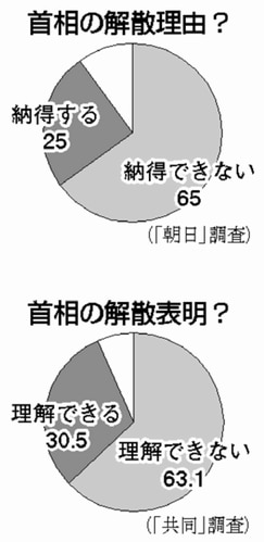 安倍晋三首相の解散表明直後に実施(19、20日)された共同通信の世論調査。解散について「理解できない」が63・1%を占めました。解散当日の「朝日」21日付世論調査も、解散理由に「納得できない」が65%の多数でした。同調査の内閣不支持が40%に跳ね上がって支持39%を上回り、第2次安倍内閣発足以来初めて支持・不支持が逆転しました。
