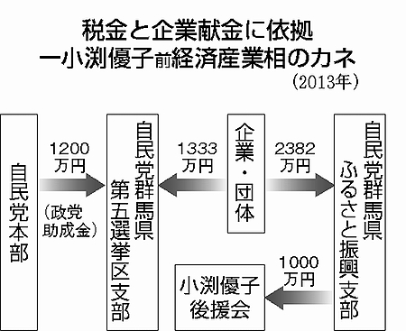 ふるさと振興支部は、本紙(9月18日付)が、いち早く小渕氏の第3の“財布”として報じたもので、幅広く企業・団体献金を集める窓口。選挙区支部以外に関連政党支部を持っている政治家は珍しく、20年前、政党助成金を導入する代わりに企業献金を禁止することを決めた「政治改革」に逆行するものです。