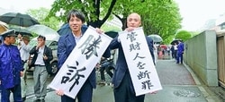 ![]() (写真)日航の不当労働行為を認定した勝利判決を伝える弁護士たち=8月28日、東京地裁前 |