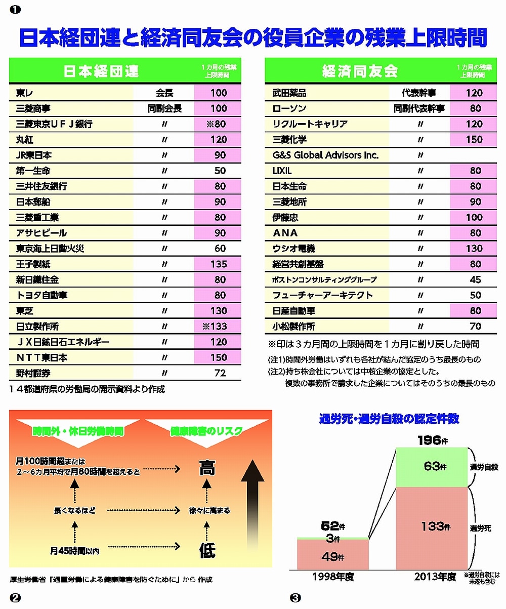志位氏は、経団連、経済同友会の役員企業35社の残業上限協定を提示(表1)。33社で「月45時間」を超える協定を結び、28社(80%)は政府が「過労死ライン」としている月80時間以上、さらに経団連会長企業の東レをはじめ13社は100時間を超えていると告発しました。