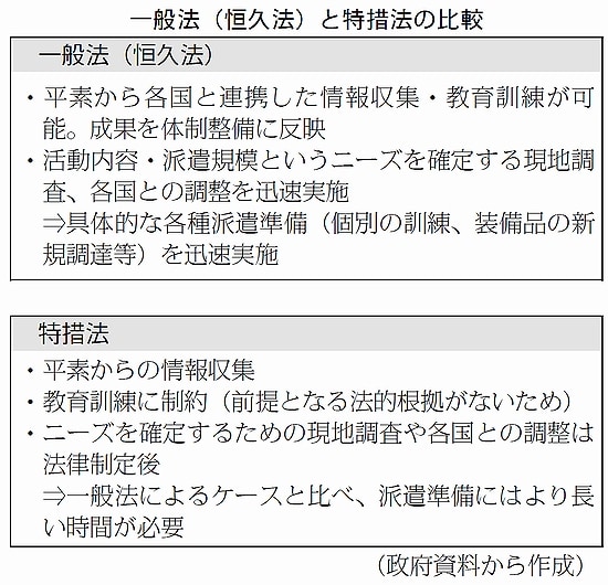 政府資料が強調する恒久法の「メリット」は何か―。常日ごろから派兵の準備を整える法的根拠ができるので、国際情勢の調査や情報収集、訓練が可能となり、装備品の新規調達も迅速に行えるようになる、というのです。(図)