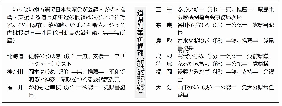 日本共産党は、10道県知事選のすべてで支持・支援・推薦・公認候補を立てるほか、41道府県議選に286人、17政令市議選に186人(24日現在)を擁立します。10道県知事選すべてで自民党候補と対決する候補を立てているのは日本共産党だけ。議員選挙でも、4年前に比べ候補者を増やしてたたかうのは日本共産党と自民党のみで、選挙戦は「自共対決」の構図となっています。(別表=対決構図)
