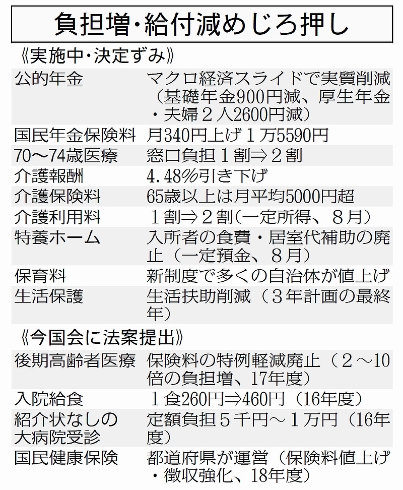 「社会保障のため」と言って消費税増税が強行されたのに、社会保障の負担増と給付減がめじろ押しです(表)。これらを推進した政党と安倍内閣の暴走にいっせい地方選で審判を下し、暮らしを守ることが重要な争点となっています。