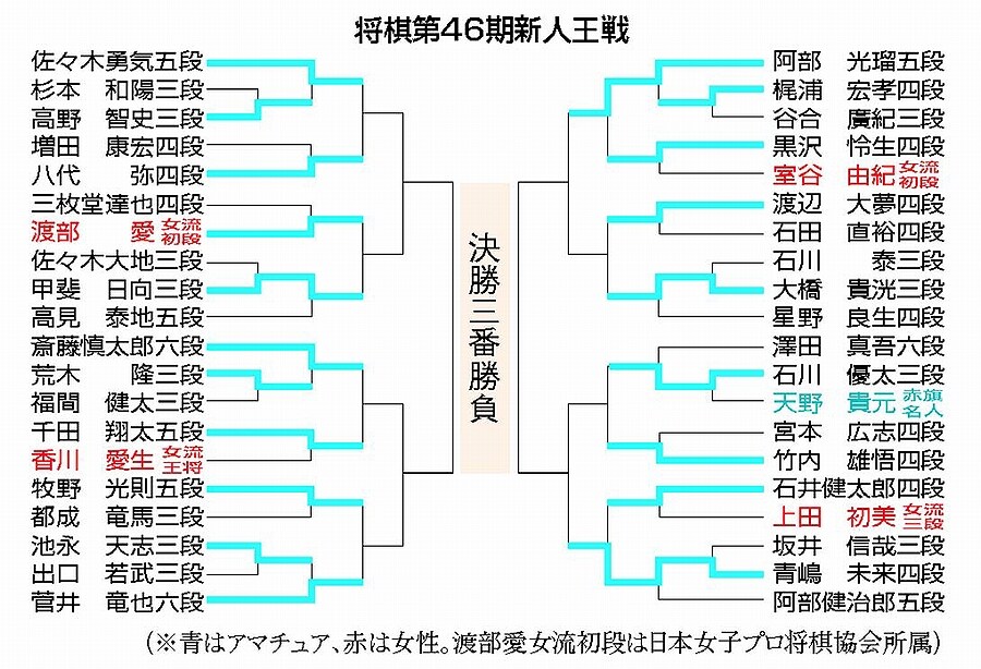 今期は六段(トーナメント開催中に昇段)3人、五段6人、四段12人、奨励会三段14人、女流4人、アマチュア代表の赤旗名人1人の40人が出場、新人王の座をめぐって腕を競っています。