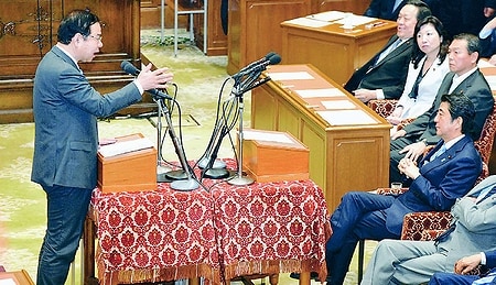 ![]() (写真)党首討論で安倍晋三首相に質問する志位和夫委員長(左)=20日、衆院第1委員室 |