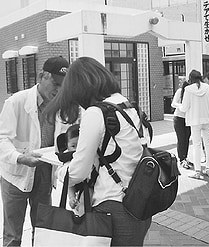 ![]() (写真)戦争法案反対の緊急宣伝・署名活動をする(右から)宗田裕之、石田和子両川崎市議=16日、川崎市高津区、溝の口駅前 |